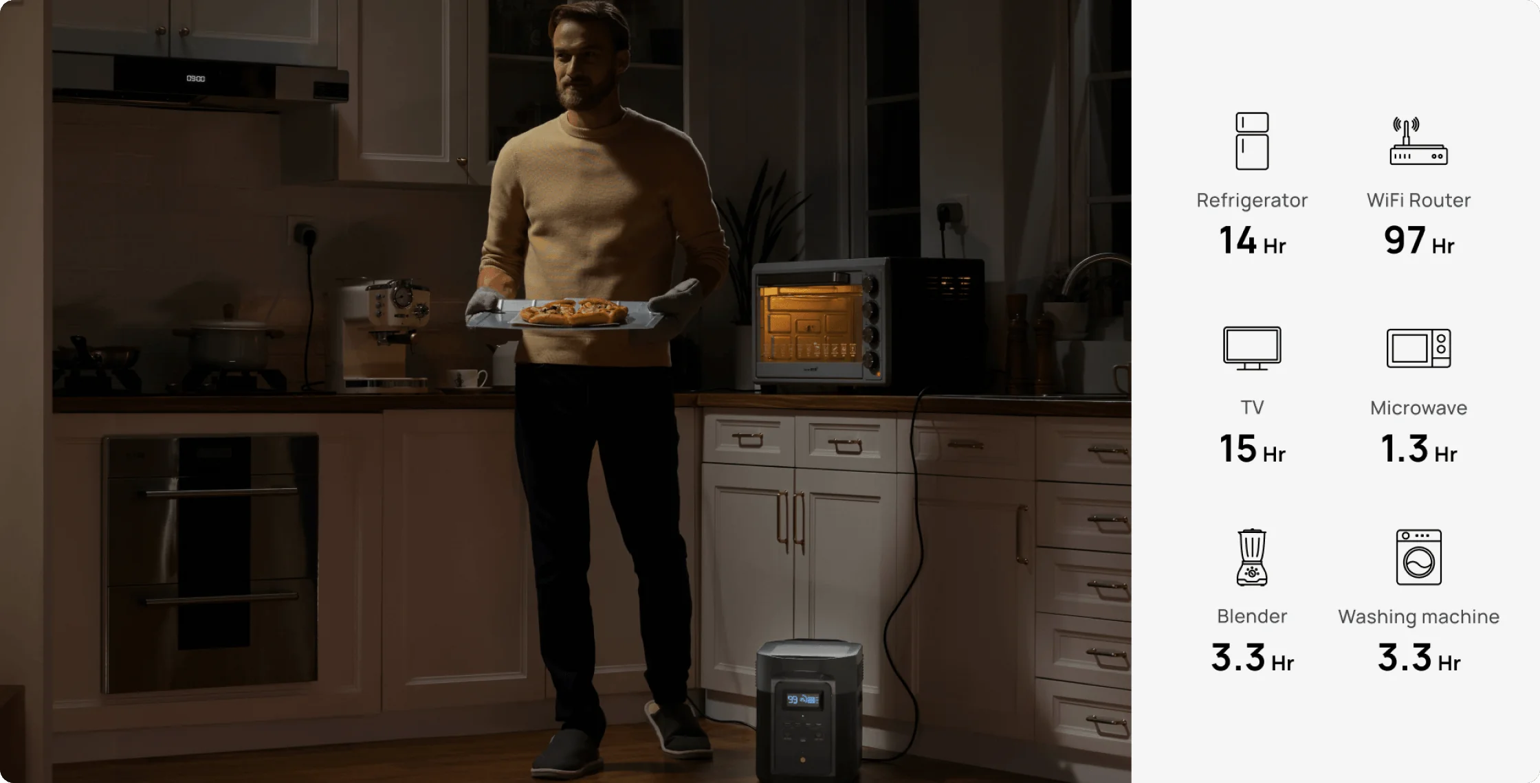 Power your essential appliances with a hefty 2400W AC output by connecting DELTA 2 Max (2kWh) and up to two Smart Extra Batteries (6kWh) with your home's transfer switch for partial home backup. With a plug-and-play design, it's easier than ever to prepare for blackouts.