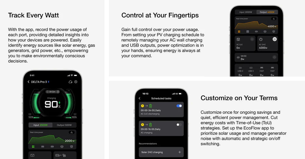 Fully manage home power from anywhere with an app. Stay connected to your home energy with the EcoFlow app anywhere, anytime. Control and monitor your power seamlessly, even remotely, during outages.