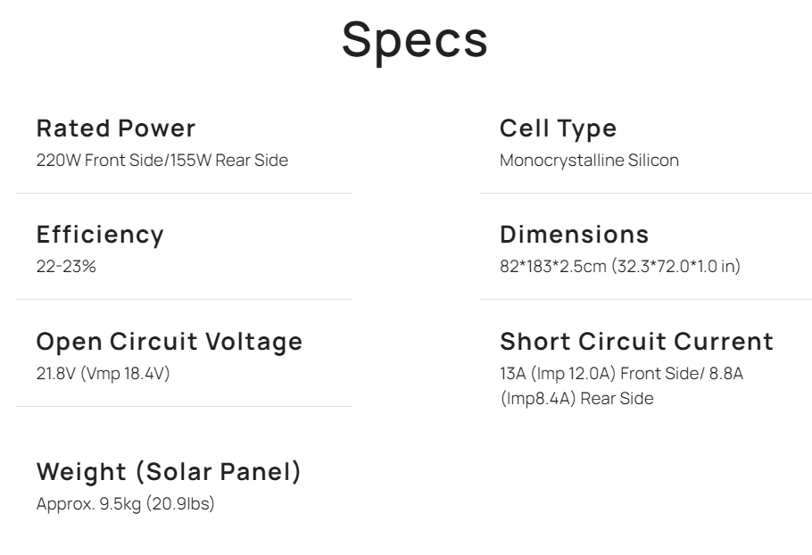 EcoFlow’s 220W Bifacial Portable Solar Panel is two in one. With a 220W primary side, and a 155W side on the back for ambient light, you can capture up to 25% more solar energy and charge your portable power station even faster.